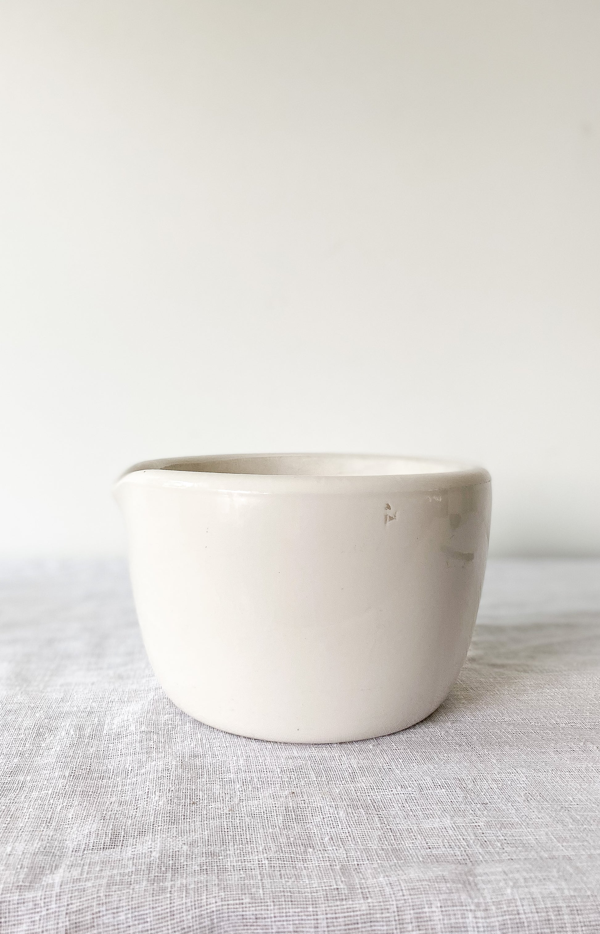 Chunky medium size Coors mortar. Measures 4” tall and 7” in diameter.