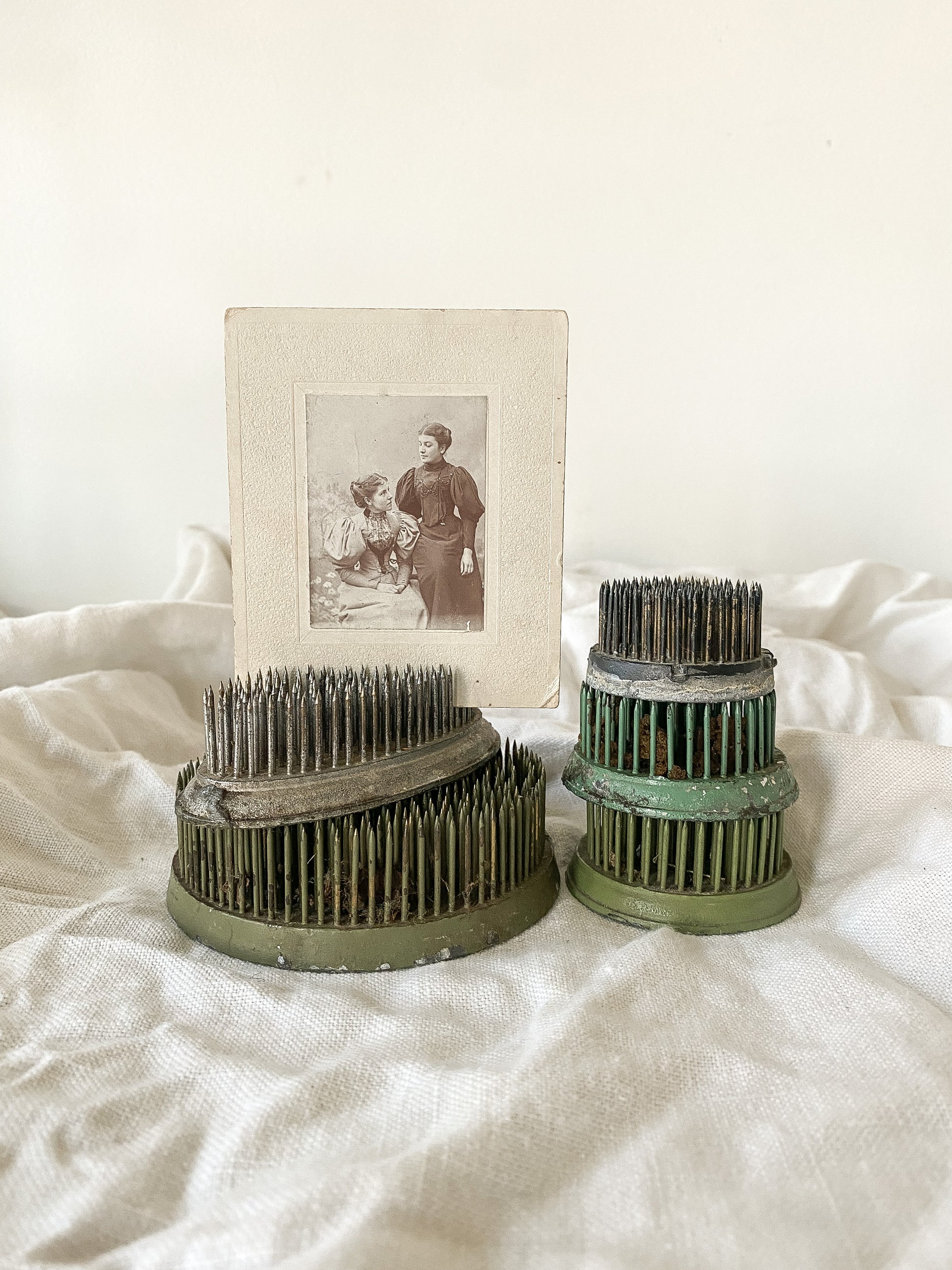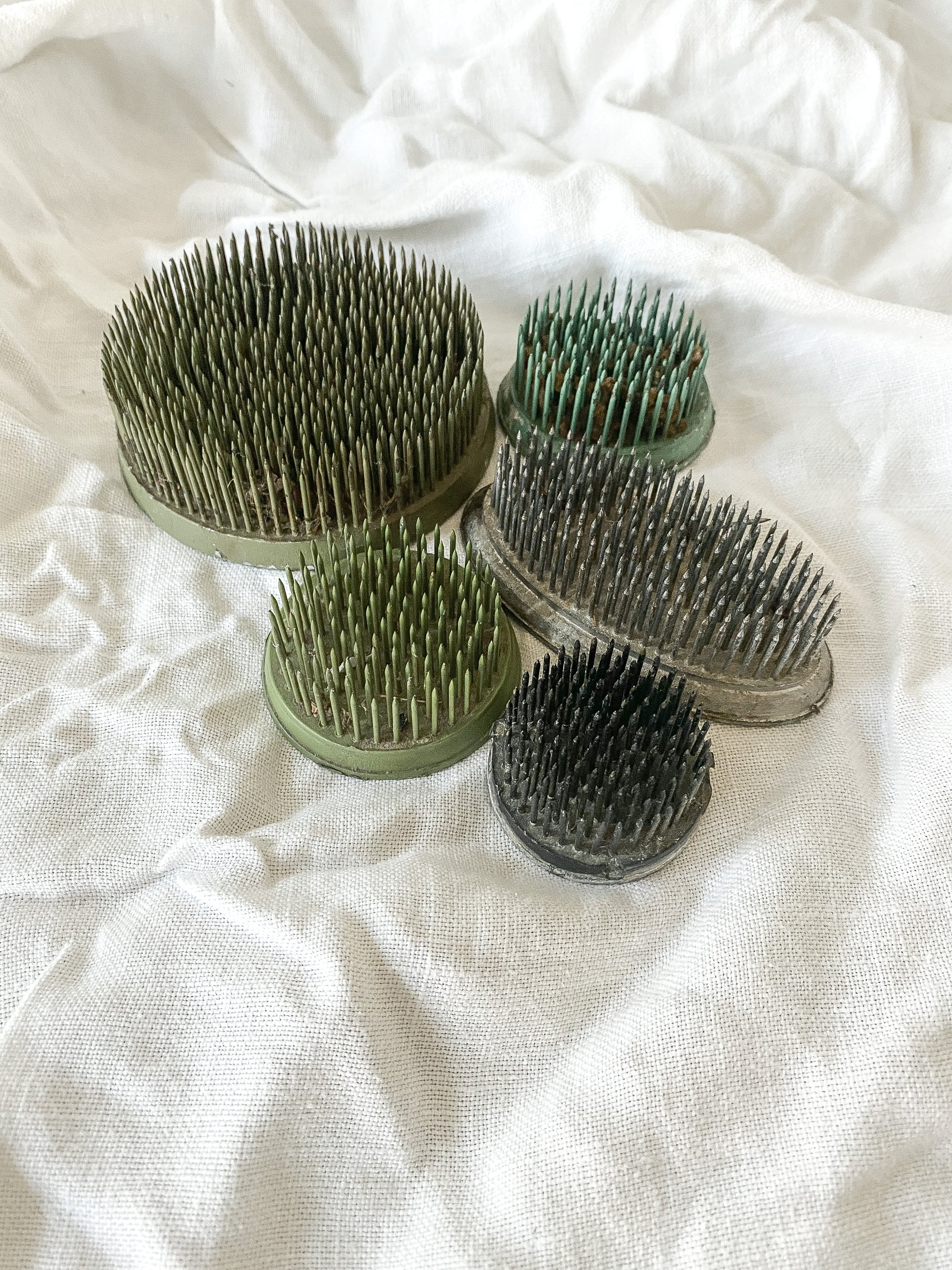 Collection of (5) Flower Frogs. Perfect for stacking, displaying in vintage garden vignettes, or displaying ephemera. Measures 1 1/2” to 3 1/2”.