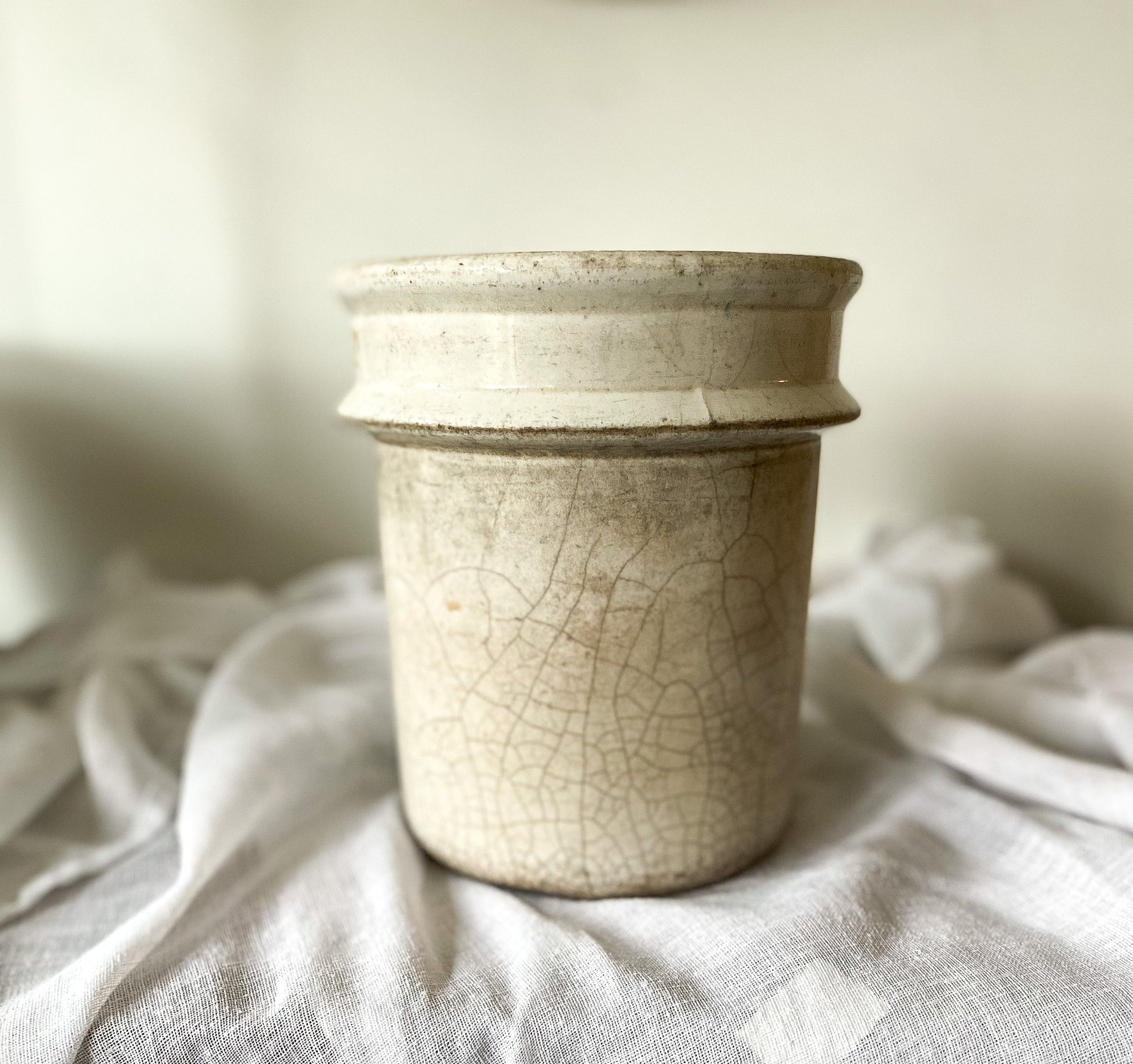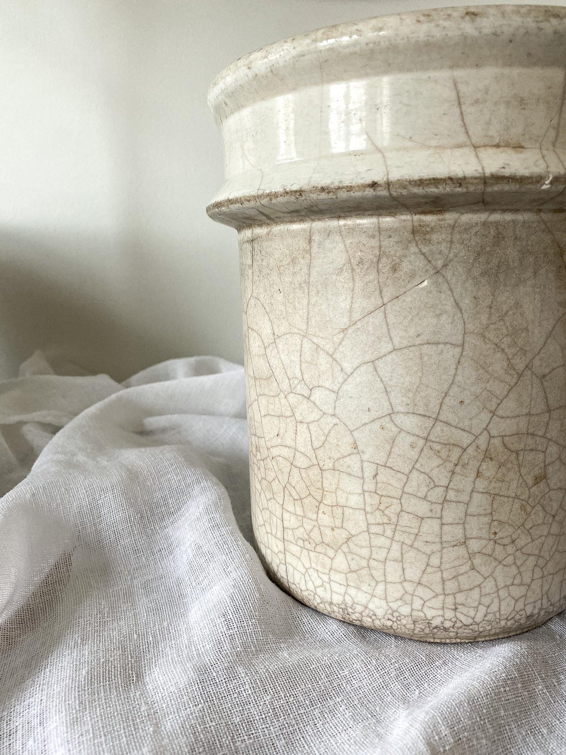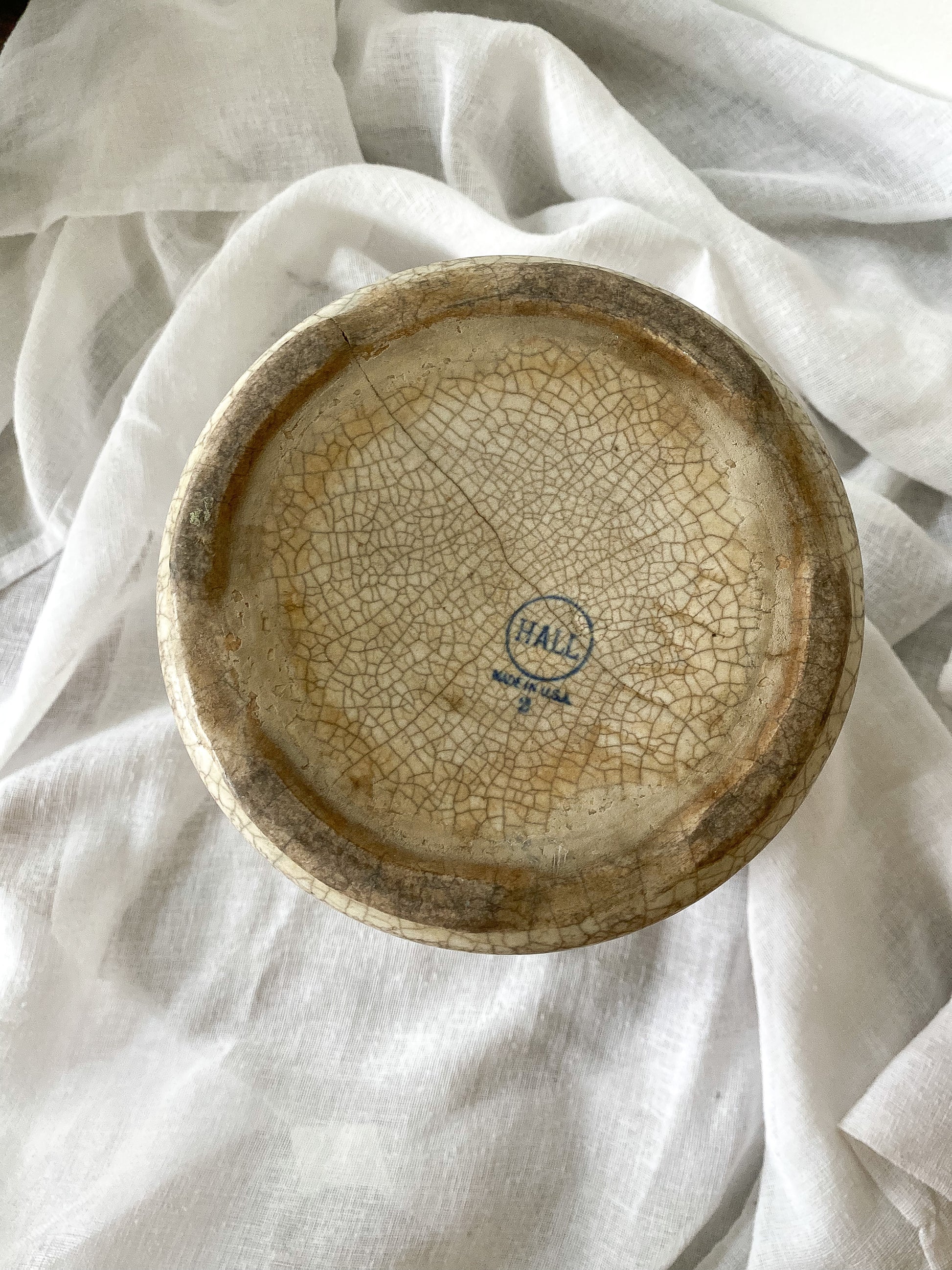 Antique heavily crazed and stained soup crock. Stamped Hall on bottom. Absolutely stunning addition to crock collections.