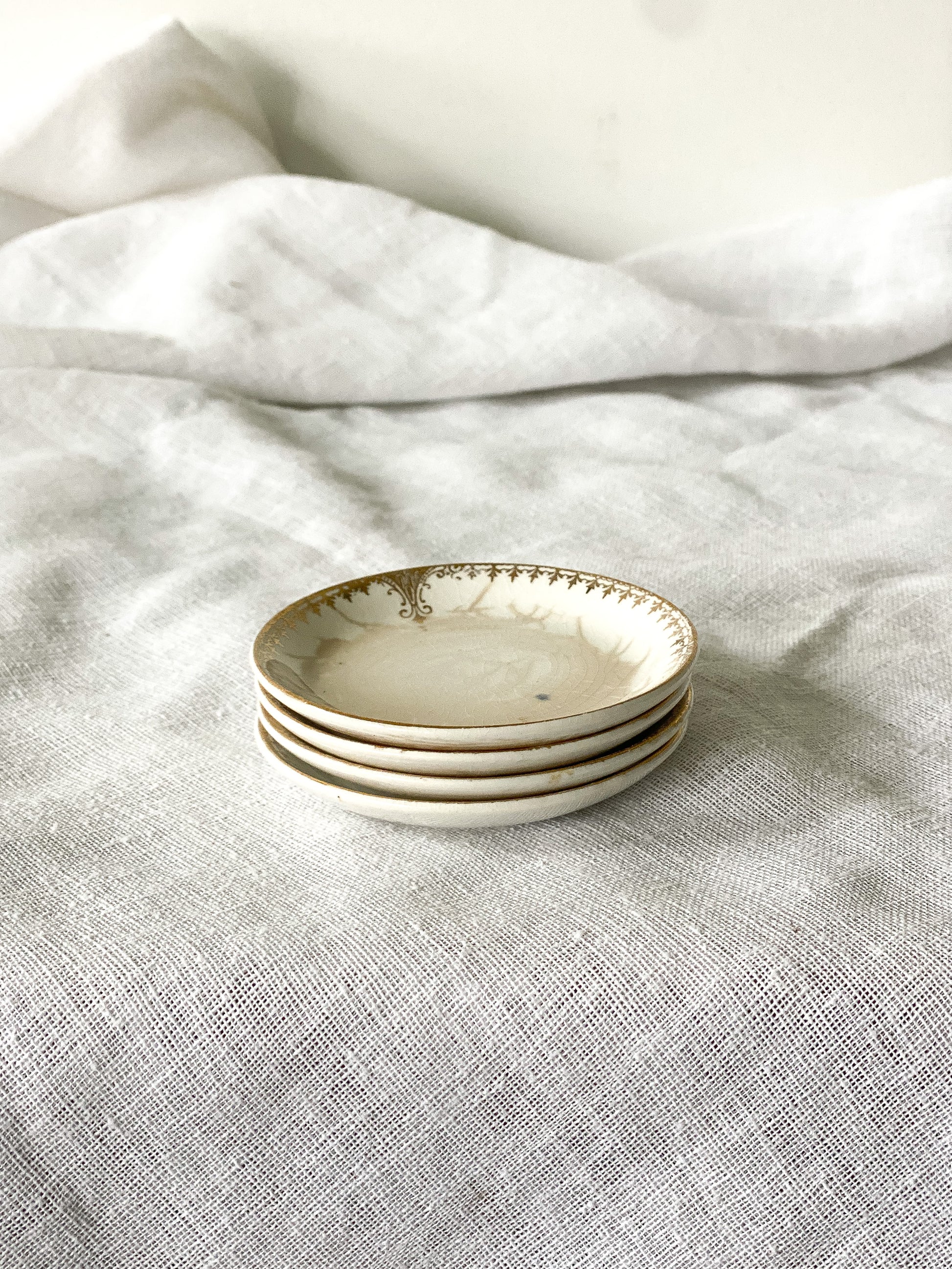 Stack of stained and crazed ironstone butter pats. Not stamped on back. Measures 3 1/2” in diameter.