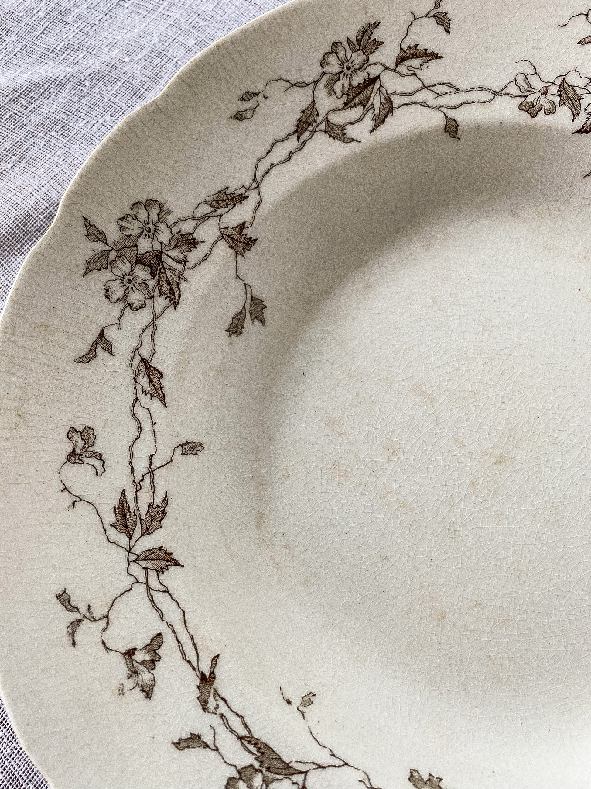 Beautiful Ironstone Aesthetic Soup Bowl. Heavy crazing and some staining are present. Measures 9” in diameter.