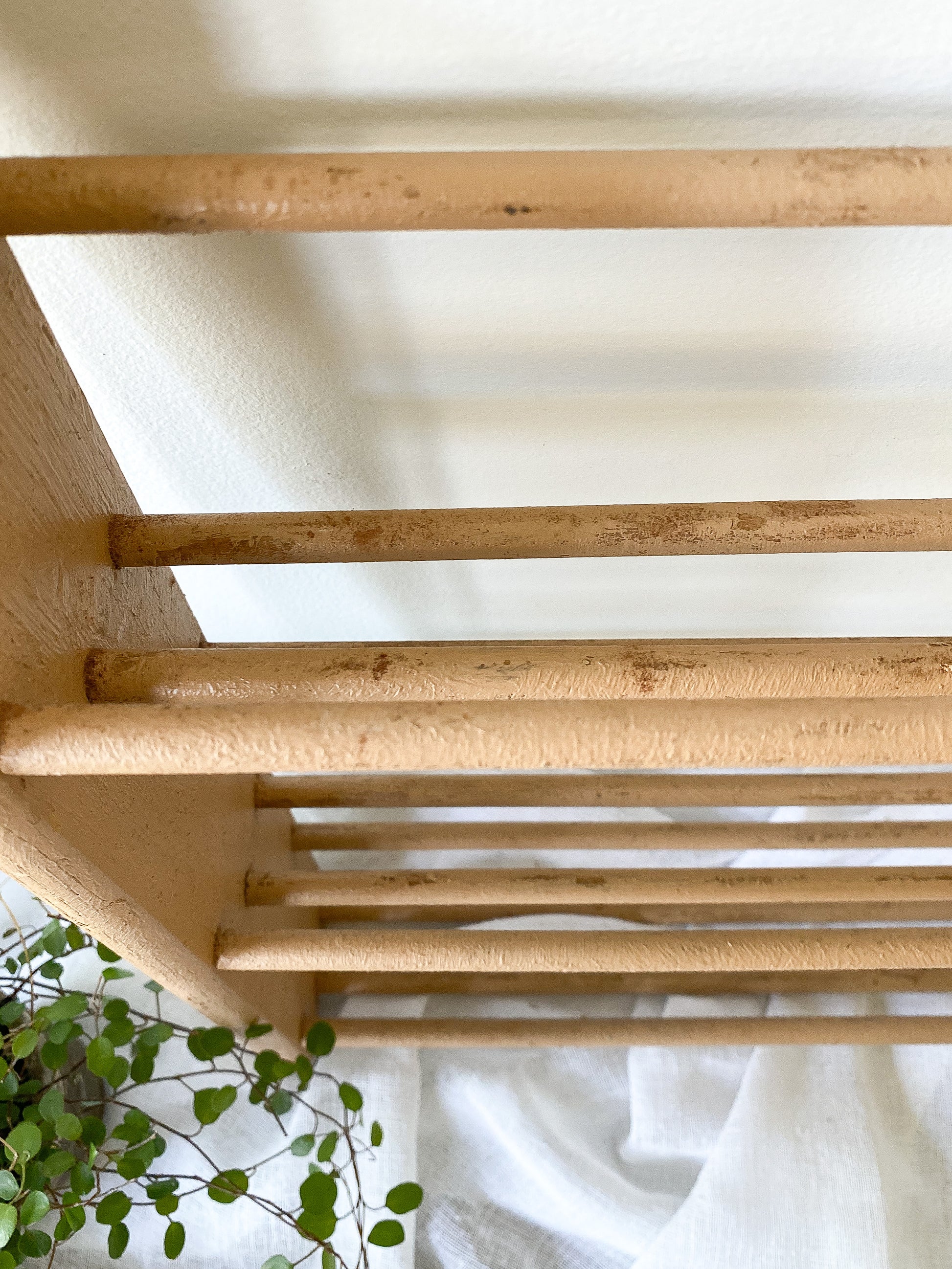 Vintage chippy peach colored rack. Measures 15 1/2” tall and 15” wide