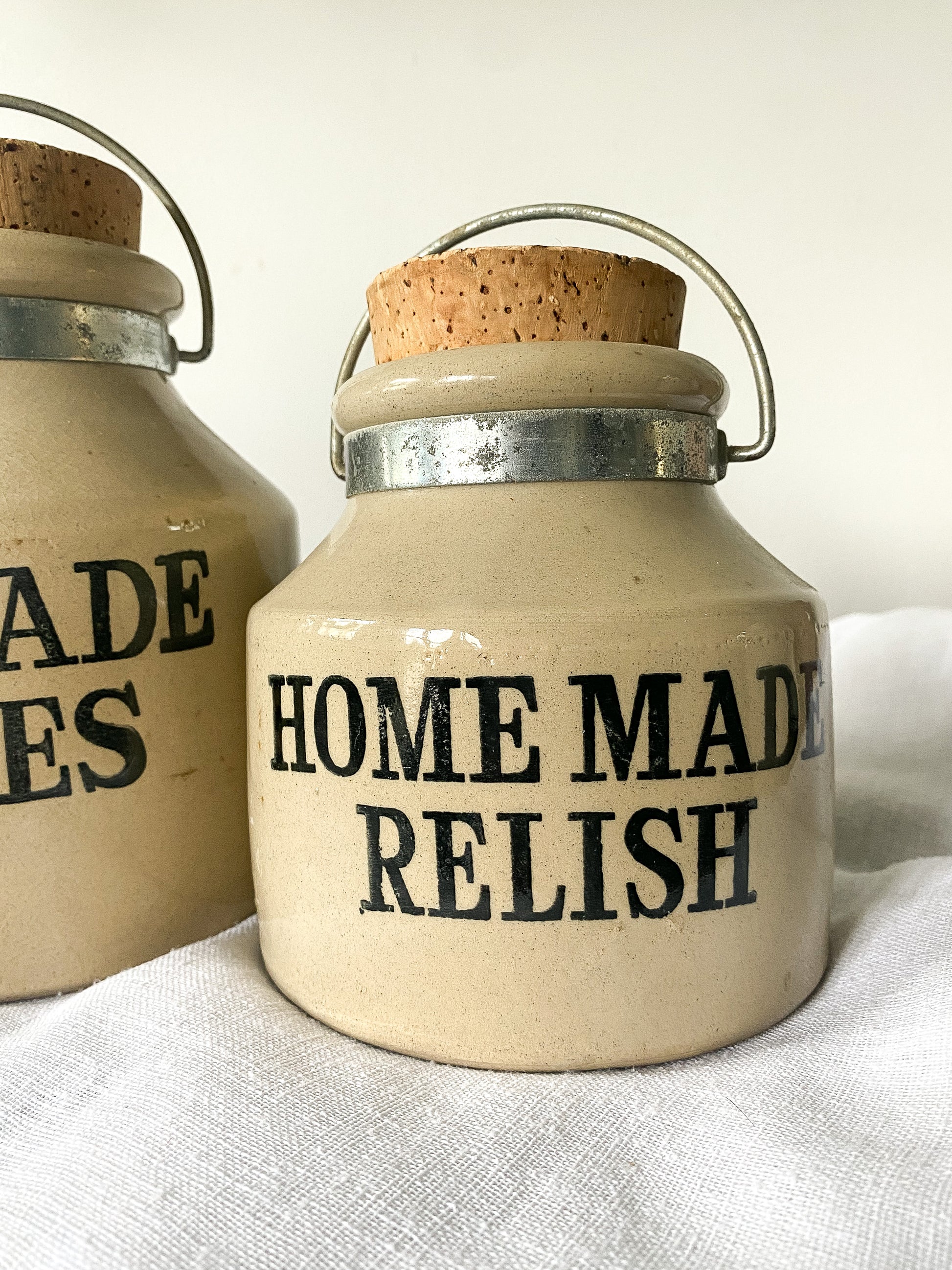 Pair of Relish and Pickle Crocks, Made in England. Heavy crazing on Pickle Crock.